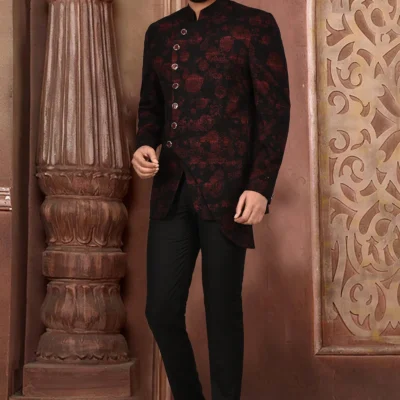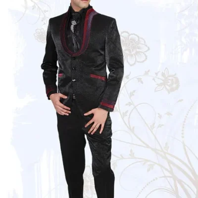 Golden Printed Polyester Lycra Tuxedo in Black and Maroon